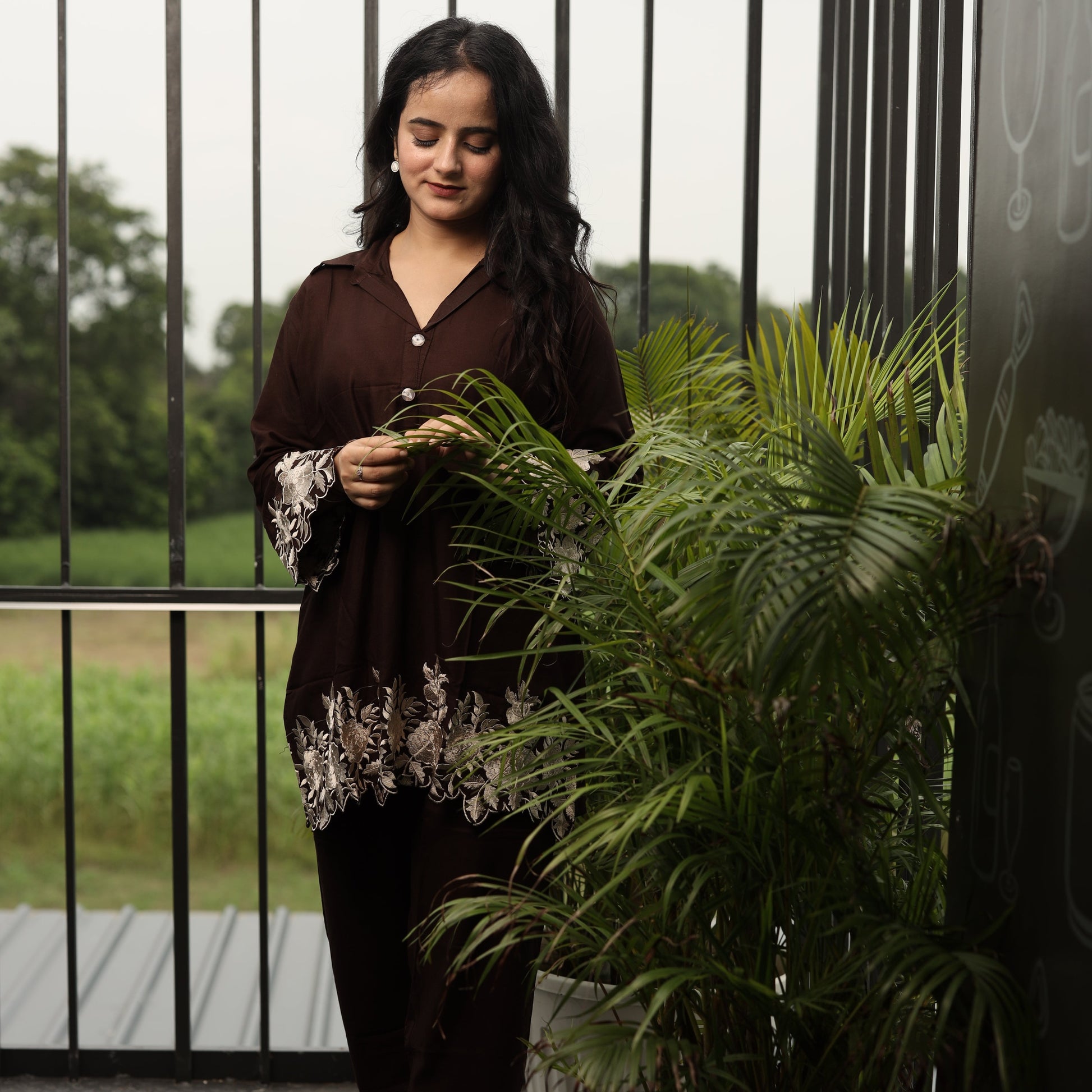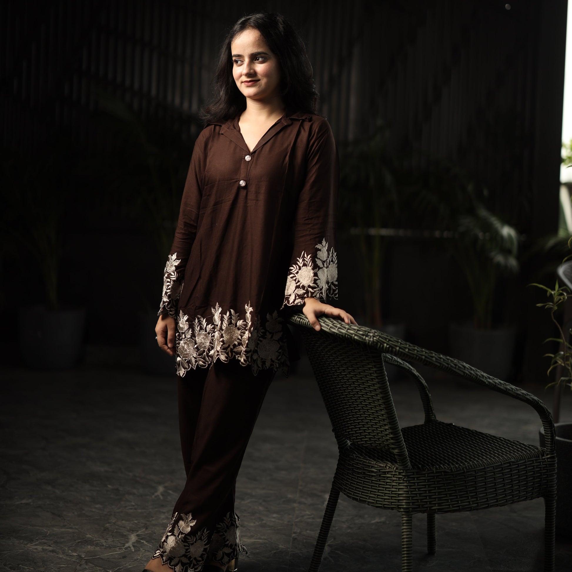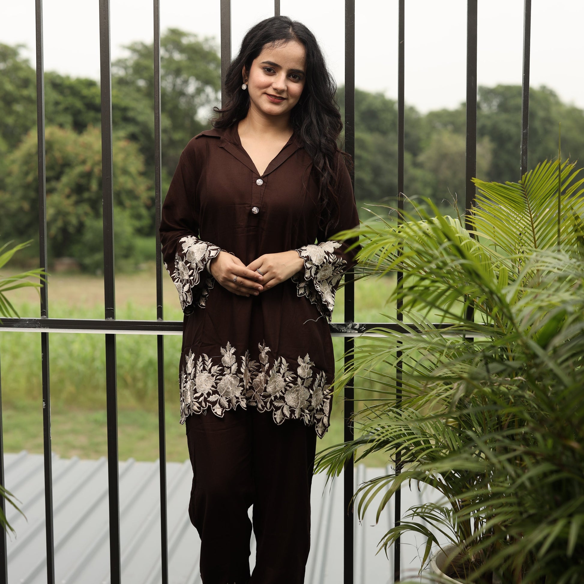 This Brown coord set with leaf cut is a stylish and contemporary outfit perfect for any occasion. Crafted with intricate leaf cut designs, it offers a modern twist on traditional attire. The soft fabric ensures comfort while the bold color adds a touch of sophistication. Ideal for casual outings or festive events, this coord set is a must-have in your wardrobe. Make a statement with this stunning ensemble today!